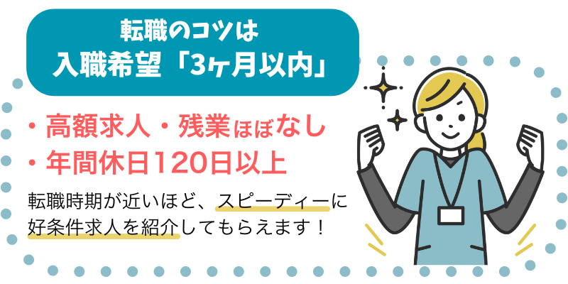 転職後のアフターサポートもありますので、実際に勤務してみて聞いた条件と違うなどあればご遠慮無くご相談ください!対応致します!